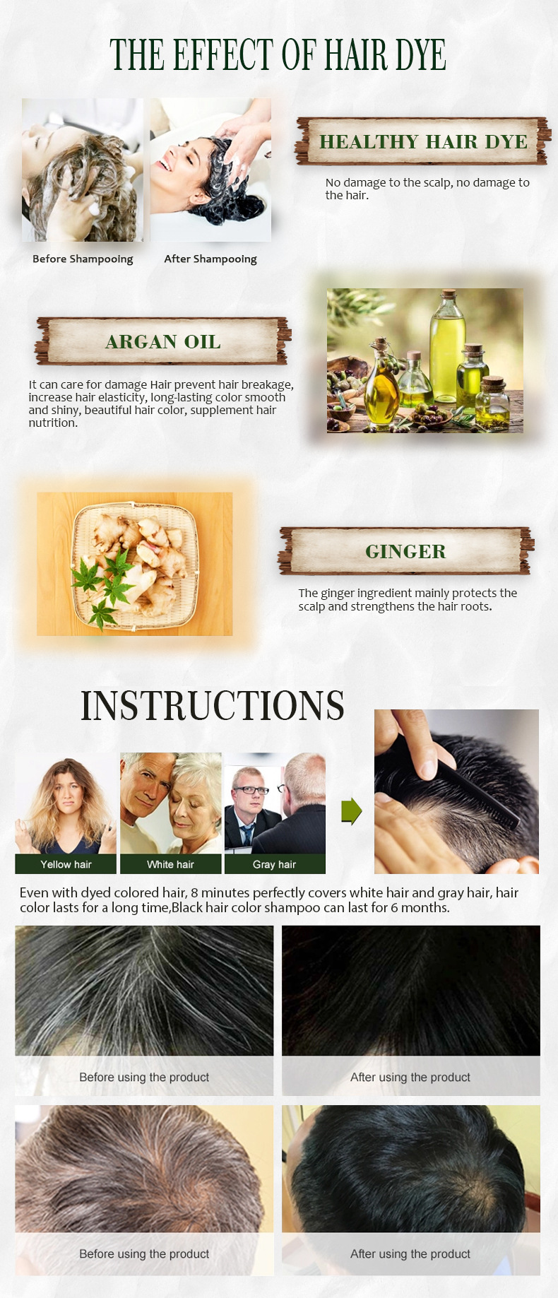 Transform your hair care routine into a ritual of natural beauty with Morocco Argan Oil Essence Hair Dye Shampoo. Embrace the power of nature and witness the transformation with every wash.