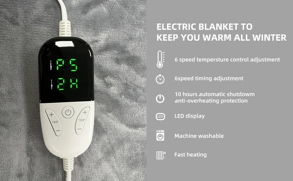 Auto-Shutoff Safety: Sleep with peace of mind. The blanket features a 10-hour automatic shutdown function, ensuring energy efficiency and preventing accidents if you fall asleep.
